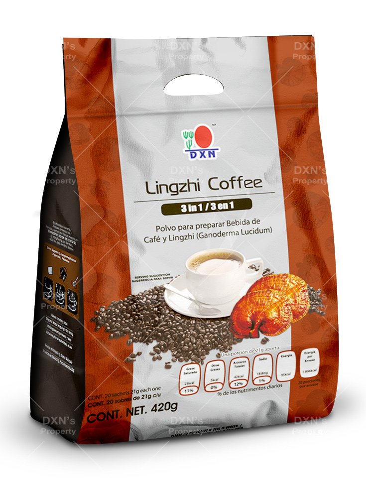 El Café Lingzhi 3 en 1 DXN es una bebida hecha con los granos de café más finos, extractos de Ganoderma, azúcar y crema baja en contenido de grasa. Gracias al Ganoderma tu organismo recibe múltiples beneficios ya que fortalece el sistema inmunológico. El Ganoderma no modifica el sabor del Café Lingzhi 3 en 1 de DXN, siendo teniendo así un delicioso sabor a café con leche. Contiene tan solo un 0.06% de cafeína por lo que no irrita al estómago ni altera tu sistema nervioso.